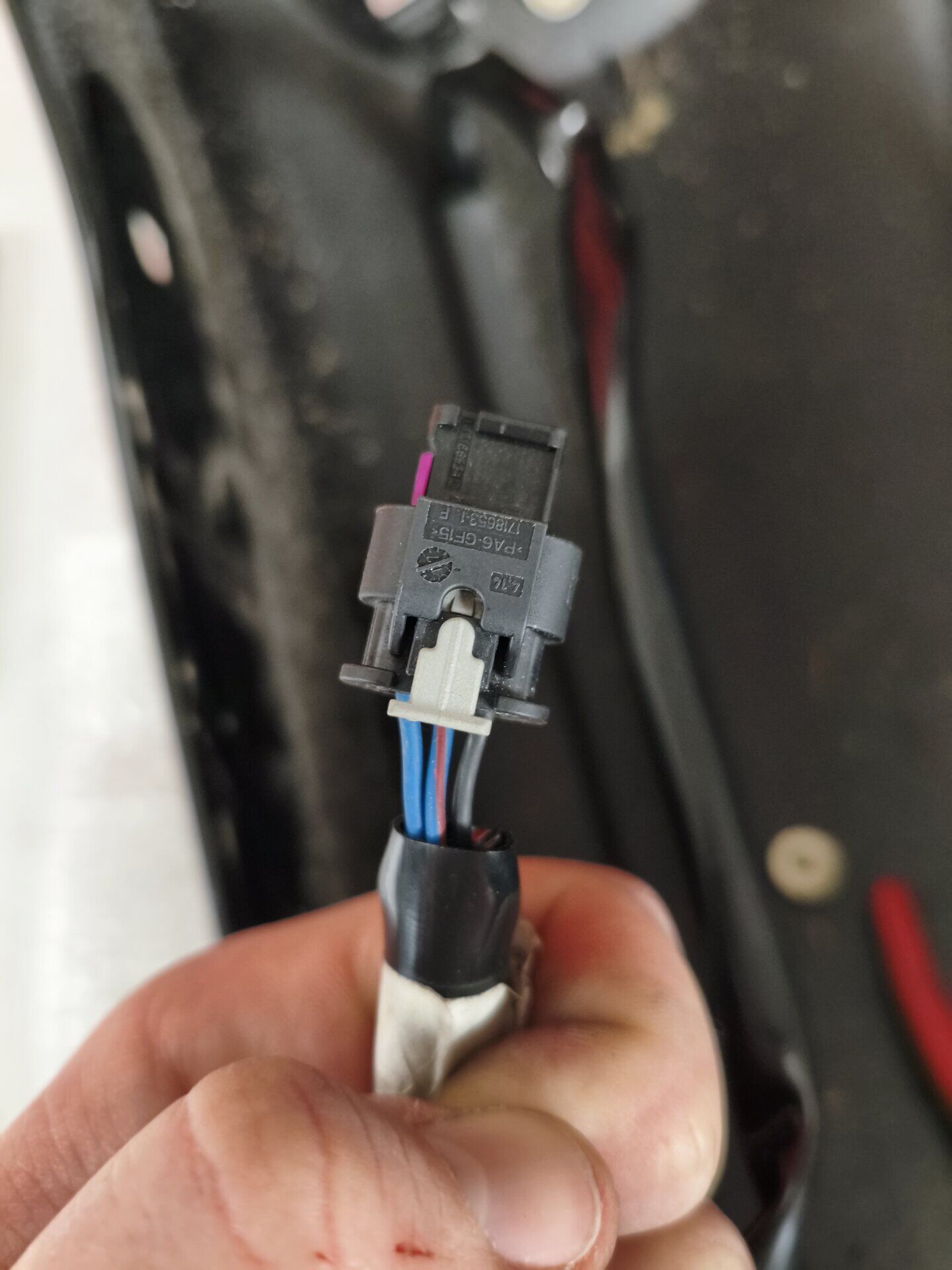 Der Stecker vom Rücklicht hat zwei blaue, ein blau/violettes und ein schwarzes Kabel.