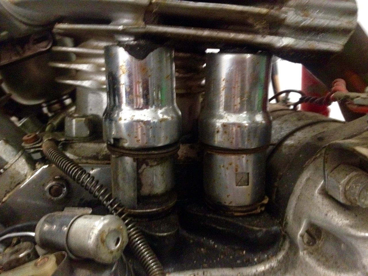 Foto 1: Das sind die Ventilschafthüllrohre am Harley- Big Flatty: Da zieht  man einen unter Federspannung stehenden Blechhalbmond seitlich raus und kann die Hüllrohre teleskopartig zusammenschieben, wie später bei den OHV Motoren ab Knuckelehead. Der Motor der vorgestellten Maschine hat die sechskantverschraubungen der Hüllrohre der „Small Flatties“ . Zusammen mit dem Nockenwellencover aus Blech und gußeisernen Zylinderdeckeln sieht das tatsächlich wie der im Brief stehende R-Motor MJ 1933 aus. Das erklärt auch, warum der so wenig gefahren wurde: der hat nämlich noch eine Frischölschmierung, oder Verlustschmierung genannt, wie ein Zweitakter.