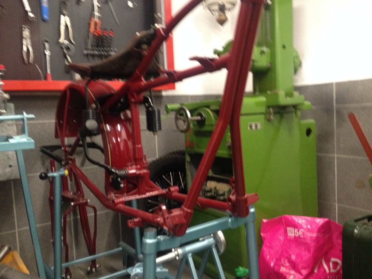 Und dass ein Bastelwastel hier noch eine Geradewegfederung an den Starrrahmen hingezimmert hat, wirkt sich sich nicht unbedingt wertsteigernd aus.