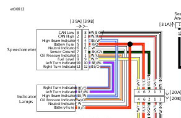 Um einen Kabelbruch vom Tacho zu den Kontrolleuchten auszuschließen, habe ich den kleinen Kabelbaum von Stecker 20A bis 39B auf Durchgang sowie Kurzschluss gemessen. Hier war alles i.O.. Auch war von 39B zu den Lötpunkten an der Platine für die Kontrollleuchten überall Durchgang gegeben.