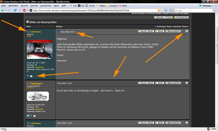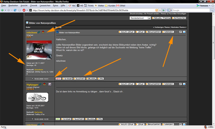Wiederum ist im Benutzerfeld links die Anordnung jetzt wie folgt: neben dem Benutzernamen ist die Geschlechteranzeige ersatzlos entfallen; ich habe mich dafür entschieden, um keine Unterscheidung mehr zwischen Mann und Frau zu machen. Schließlich sind bei Beiträgen von Frauen die Themen meist sofort ins Lächerliche abgedriftet, was ja nicht sein muss. Das "Haus" (Anzeigen auf Landkarte) entfällt ersatzlos; man kann, wie bislang auch schon, einfach den Ort unter dem Avatar anklicken und erhält dasselbe. Der Link zu den Benutzerbildern rutscht jetzt nach unten in die Funktionsleiste jedes Benutzers und ist stets der erste Eintrag, erkennbar an der Grafik, sofern Bilder eingestellt sind. Dann kommen Homepage (sofern eingetragen), ICQ (sofern eingetragen), IP-Adresse und Private Nachricht senden. Buddy, E-Mail senden und Beiträge suchen entfallen ersatzlos. Diese Funktionen erreicht man jetzt nur noch über das Benutzerprofil. Das wiederum ist, wie bisher auch schon, über einen Klick auf den Benutzernamen zu erreichen.