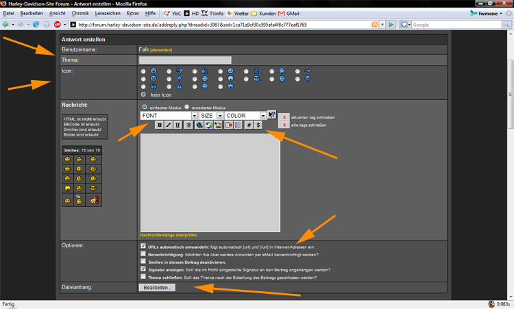 Feld "Benutzername" entfällt, weil man ohnehin eingeloggt ist und für gewöhnlich keinen weiteren Benutzernamen hat. Feld "Thema" entfällt außer beim Erstellen eines neuen Threads, weil diese Funktion kaum genutzt wurde bzw. wenig Sinn ergibt. "Icon" entfällt außer beim Erstellen eines neuen Threads. Die Änderung des Schrift-Fonts entfällt komplett, weil das nie genutzt wurde. "SIZE" und "COLOR" wurden eingedeutscht. Die Codes "PHP-Code" und "Code" wurden entfernt, weil sie nutzlos waren. Die Anzeige, was erlaubt ist und was nicht ("HTML ist nicht erlaubt, BB-Code, ...") wurde entfernt - schaut sich eh keiner an. Die Options-Felder unter der Beitragsansicht wurden stark verkürzt und durch Standards ersetzt, weil man diese Optionen ohnehin nur in absoluten Ausnahmen geändert hat.